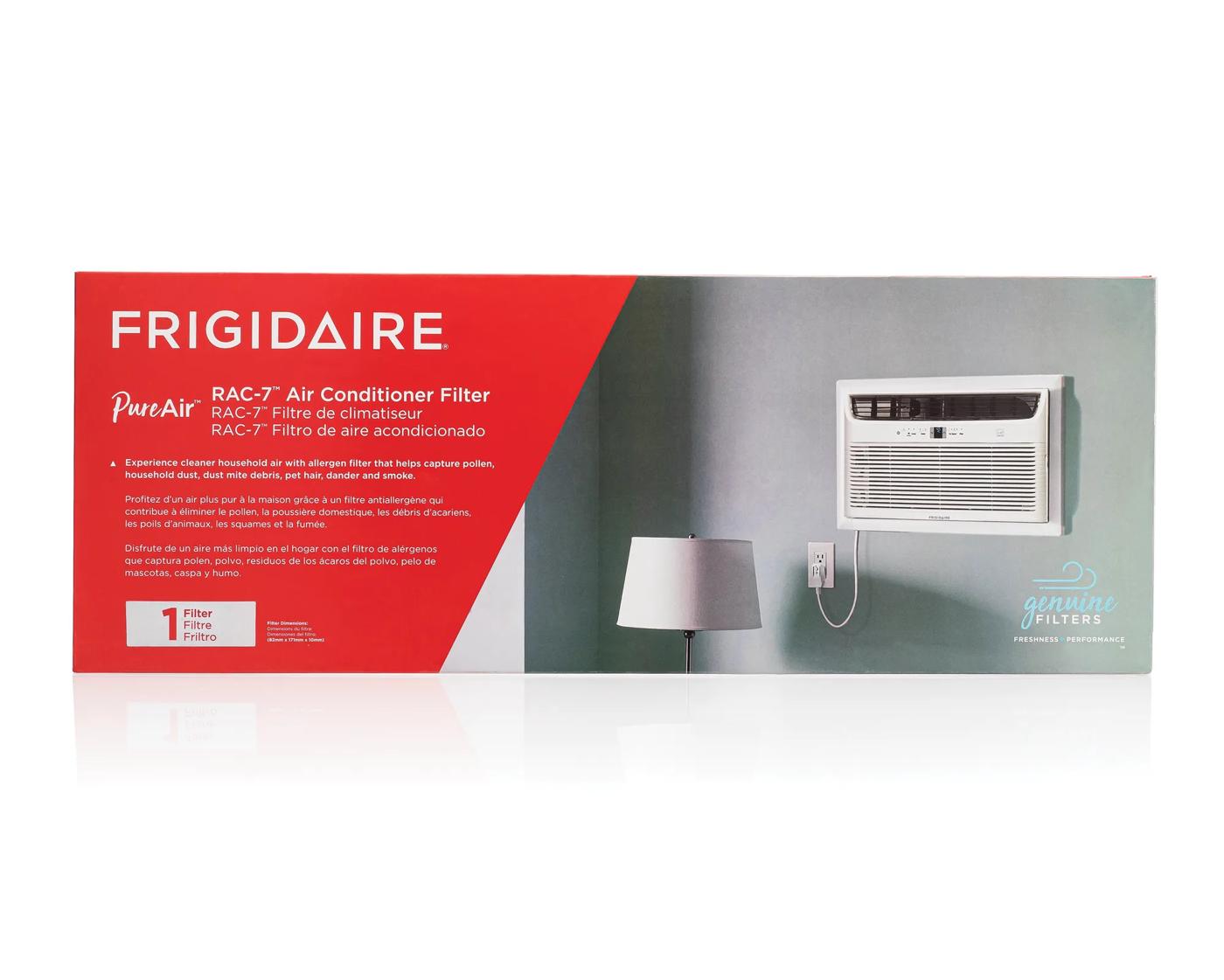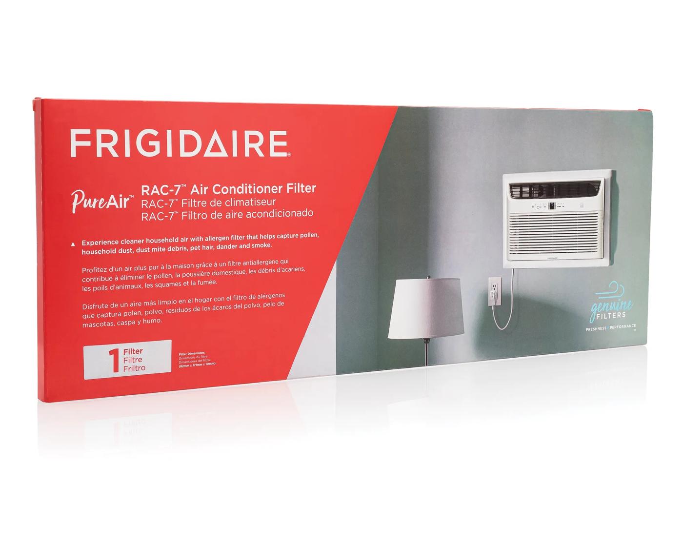Enjoy fresher room air with the PureAir® RAC-7™Air Conditioner Filter. This air filter captures household dust, dust mite debris, pet hair, dander, smoke, and other fine particles. Experience cleaner household air with the high air flow design that proactively captures unwanted particles from the air as it passes through the filter. For optimal performance replace every 6 months or as needed. The PureAir® RAC-7™ Filter is recommended for optimal performance of select Frigidaire A/C units. See fits models list below.