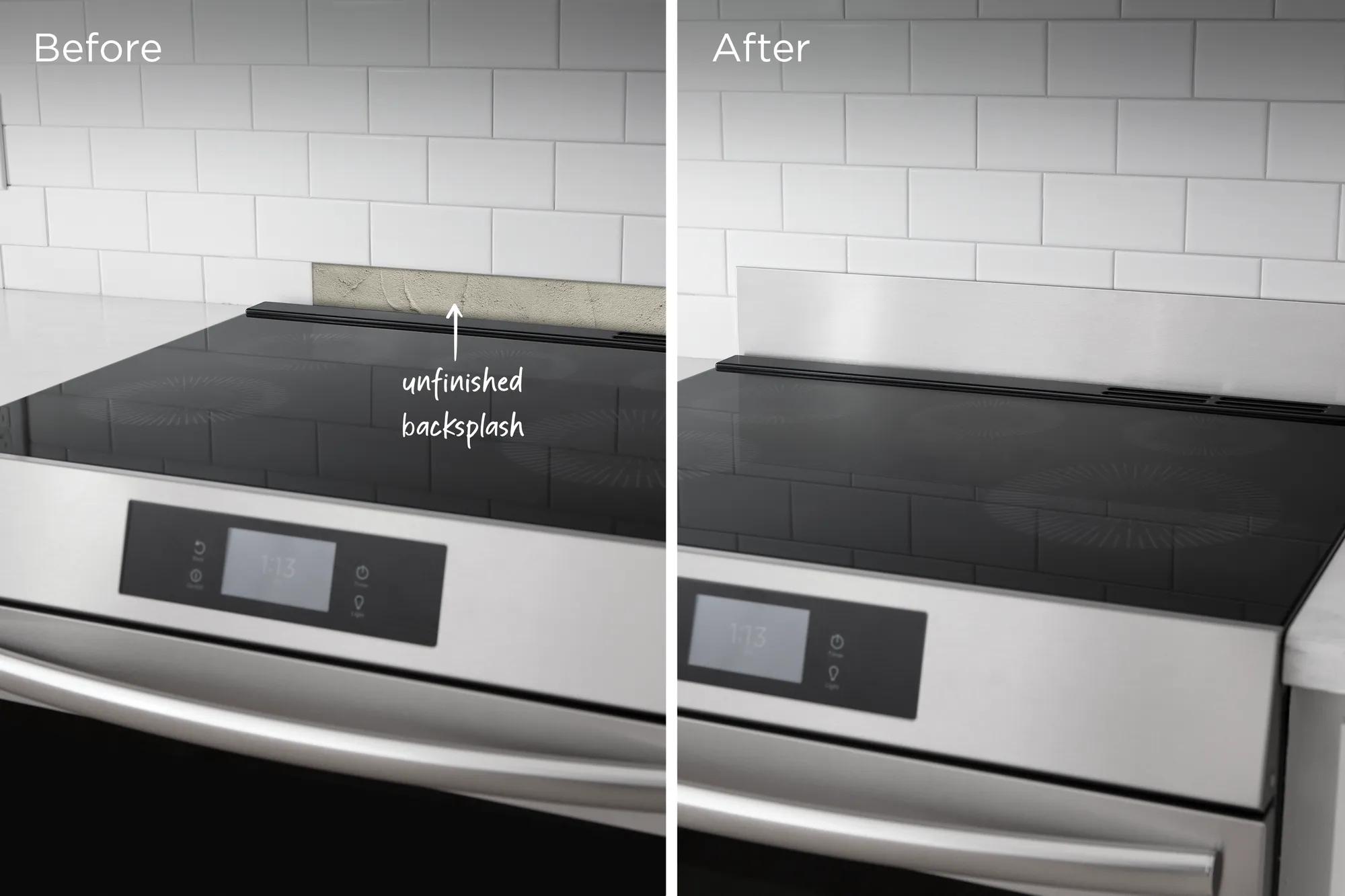 For added protection of the rear wall behind your Freestanding Front Control Range, use the Frigidaire Universal Backguard. In addition to protecting the wall from steam, splatters, and sprays from cooking, it can also cover up untiled backsplash areas and create an upgraded look. The Backsplash Trim Kit is easy to install and includes both adhesive tape and hardware for any installation. Features a smooth stainless steel finish that holds up to normal day to day use. Works with all brands of 30" Front Control Freestanding Ranges.