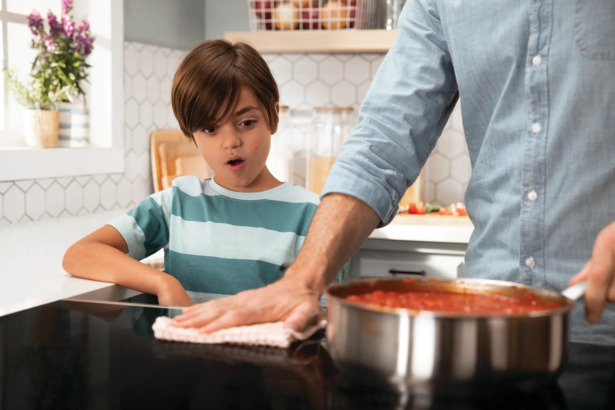 Unlike traditional electric and gas cooktops, Induction only heats the pan and the food in it, so the area around the pan stays cooler, allowing you to clean up spills and splatters while you cook.