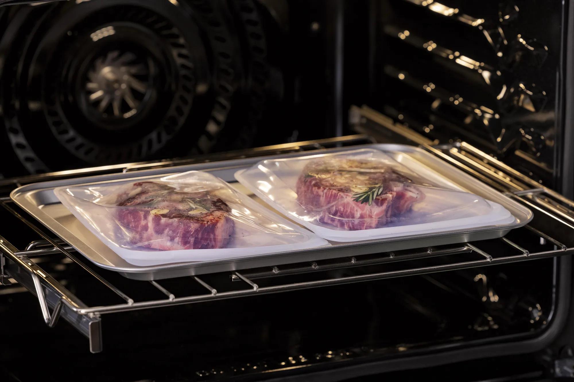 With Steam Bake, steam evenly circulates throughout the oven cavity, resulting in breads and muffins that rise higher and are light and fluffy.