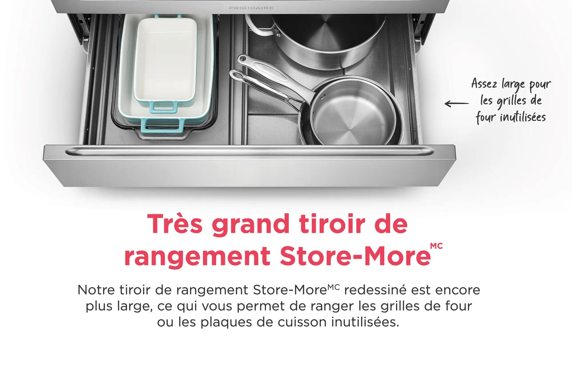 Notre tiroir de rangement Store-MoreMC redessiné est encore plus large, ce qui vous permet de ranger les grilles de four ou les plaques de cuisson inutilisées, et plus encore!