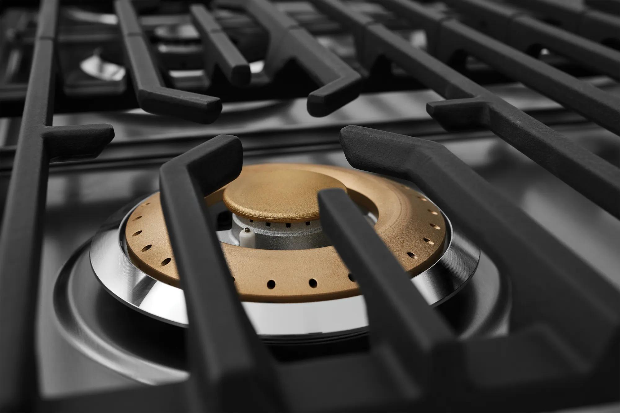 La surface de cuisson à six brûleurs offre une flexibilité de cuisson optimale grâce à des brûleurs à double puissance qui passent rapidement de l’ébullition au mijotage.