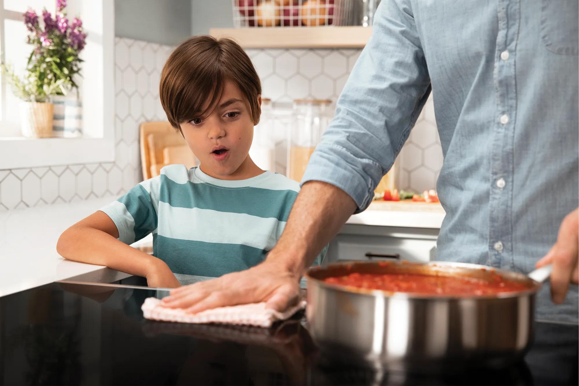 Contrairement aux tables de cuisson électriques et à gaz classiques, l’induction ne chauffe que la casserole et les aliments qu’elle contient. La zone autour de la casserole reste donc plus froide au toucher, ce qui vous permet de nettoyer les déversements et les éclaboussures pendant la cuisson.