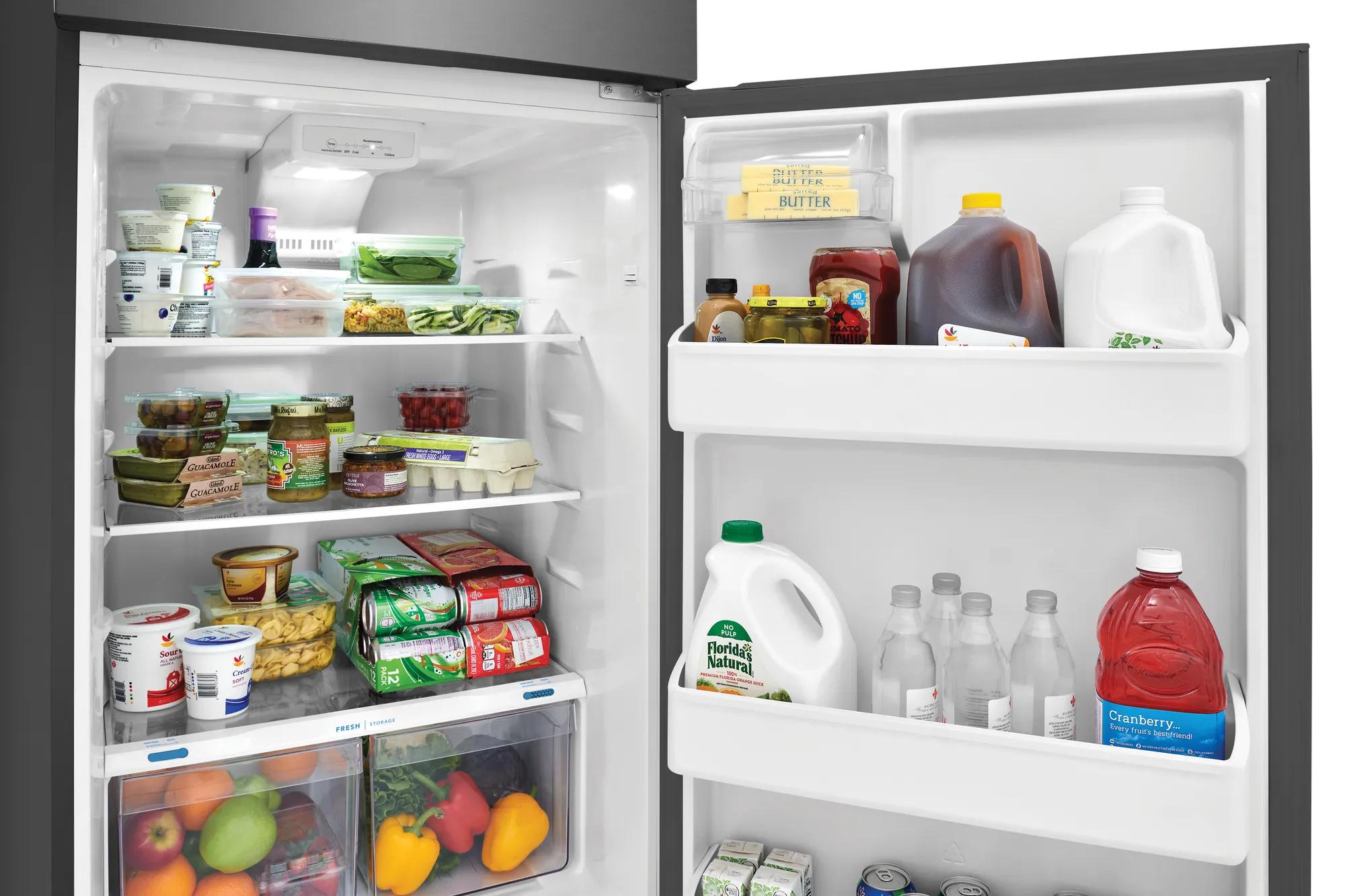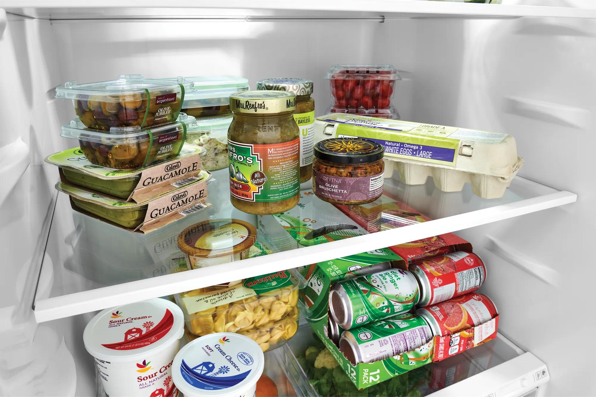 Trouvez un endroit pour tout grâce à nos options de rangement intérieur spacieuses conçues pour les familles occupées, y compris deux clayettes en verre d’un bord à l’autre, des bacs de porte d’un gallon, une clayette de congélateur grillagée pleine largeur et un bac à produits laitiers.