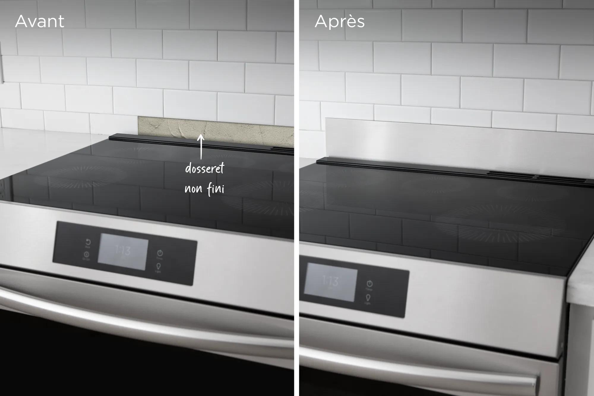 Ajoutez une touche professionnelle à votre cuisine ou couvrez les zones inachevées de votre dosseret grâce à une protection arrière élégante de 4 pouces adaptée à votre cuisinière à commande frontale.