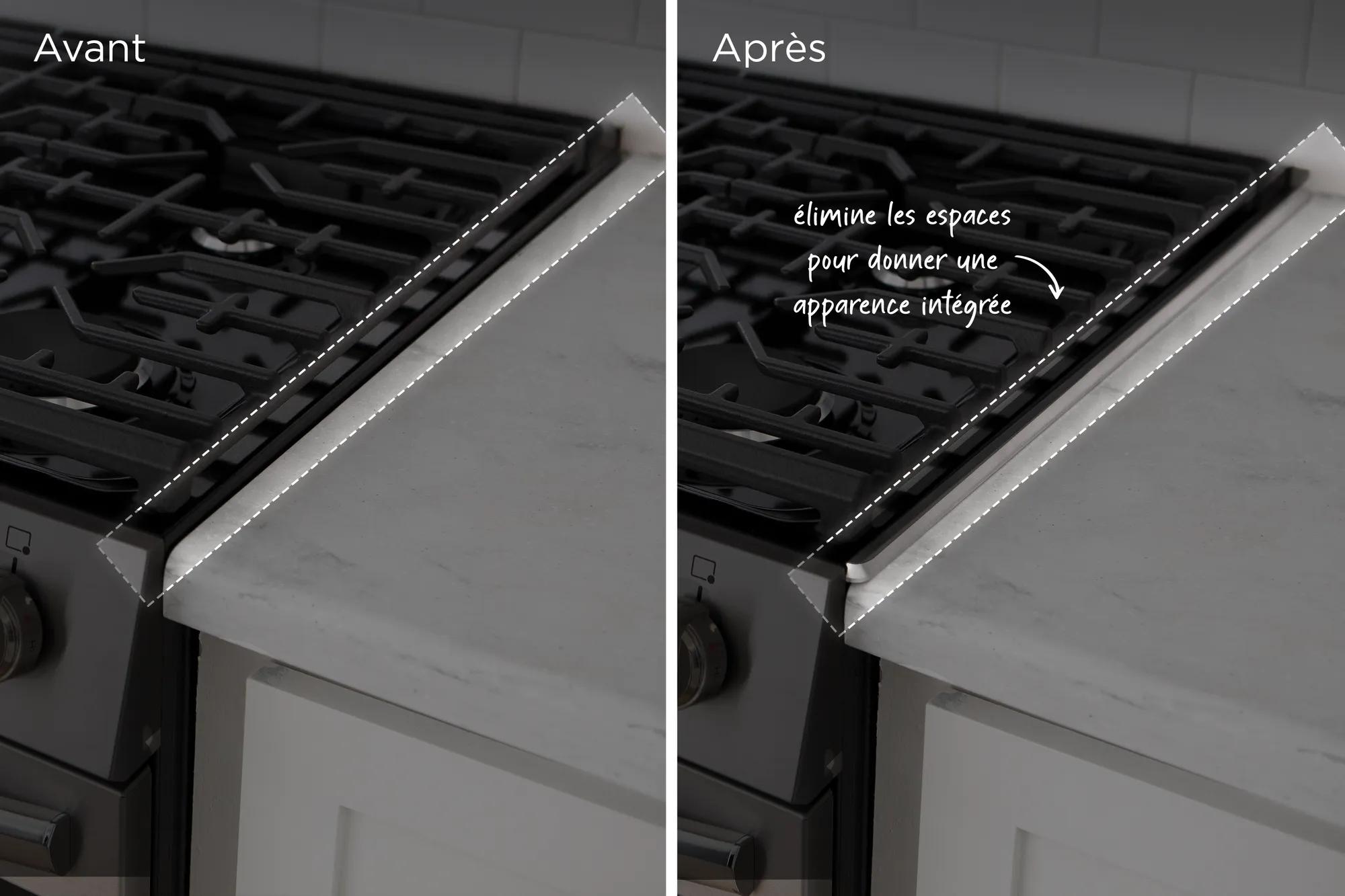 L’ensemble de garnitures 4 pièces pour cuisinière à gaz vous permet d’obtenir un aspect homogène à l’arrière et sur les côtés de votre cuisinière en recouvrant les découpes de comptoir surdimensionnées.